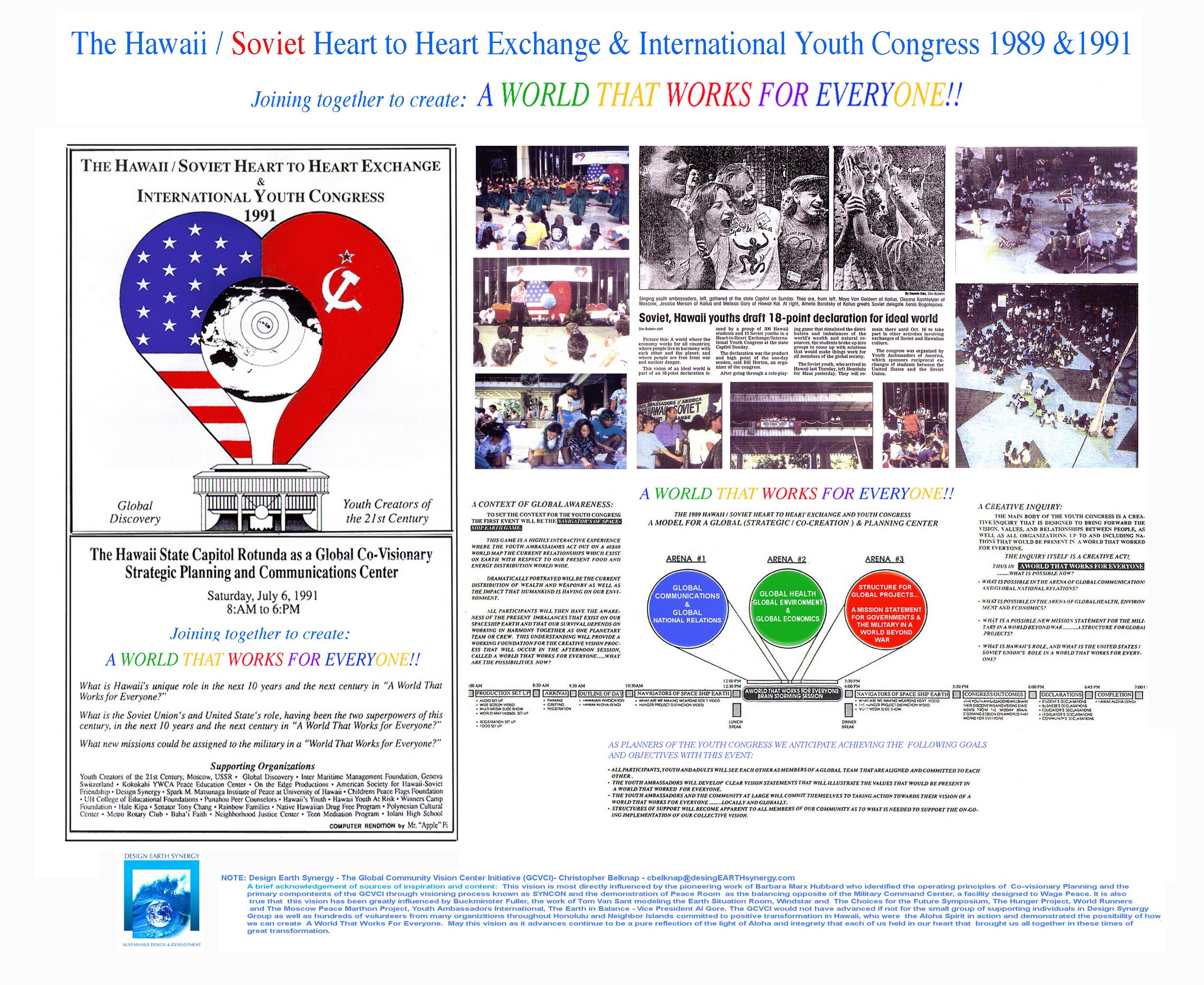 These events included two International Youth Conferences held at the Hawaii State Capital Building that modeled a Global Vision Planning Center, and demonstrated the central themes and functions of an Earth Situation Room and Community Vision Forums. This event, and the subsequent series of events, built upon the visionary inspiration and leadership of R. Buckminster Fuller – “World Game” / Barbara Marx Hubbard – “The Peace Room & Community Vision Centers” and Tom Van Sant – “Earth Situation Room”. The Hawaii / Soviet Heart to Heart Exchange and International Youth Congress, 1989 & 1991- envisioning “ A World that Works for Everyone” was attend by 11 Youth Ambassadors from the Soviet Union and approximately 300 Youth Ambassadors from the United States.
