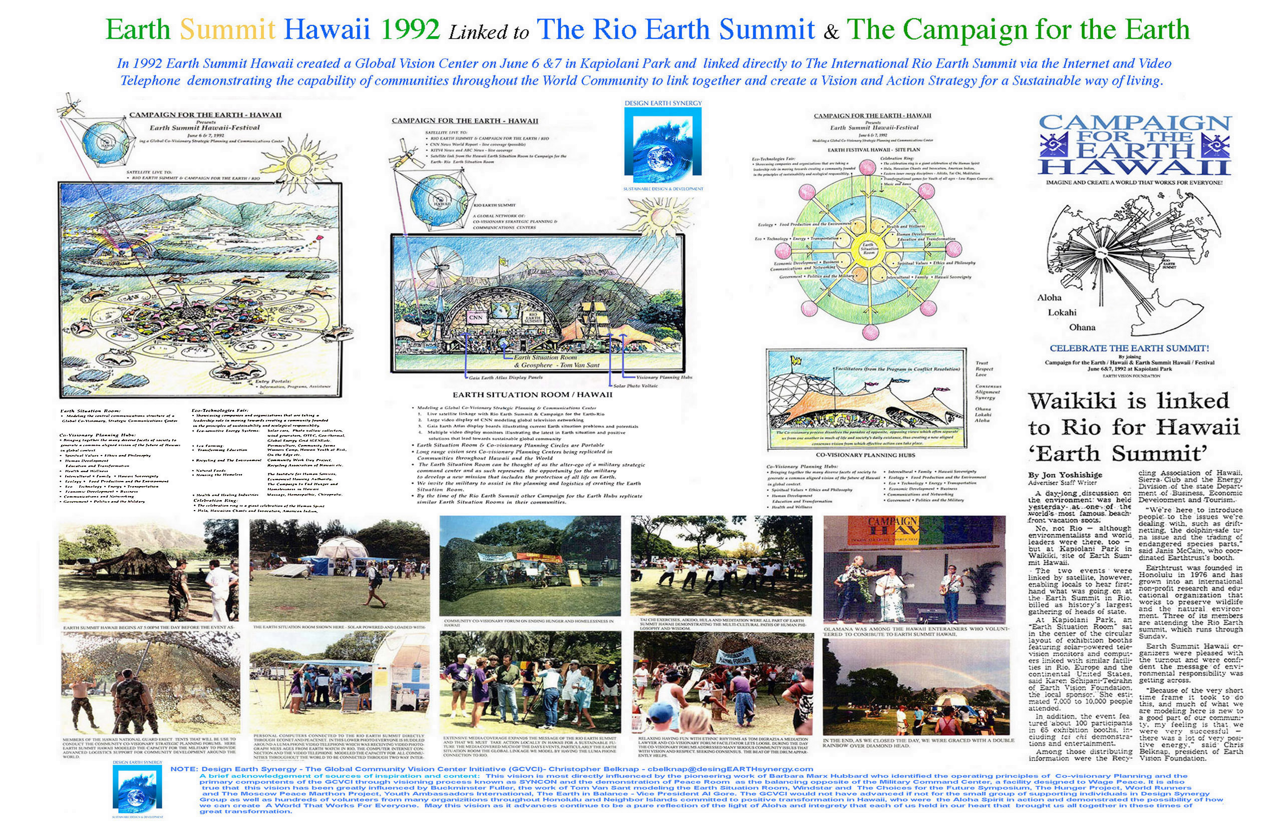 Earth Summit Hawaii modeled the functions of an Earth Situation Room, as well as Community Vision Forums, and demonstrated that communities from around the World could collaboratively envision and develop action plans for a sustainable community working at their own local level, while at the same time being connected globally through the emerging World Wide Web (The Internet).