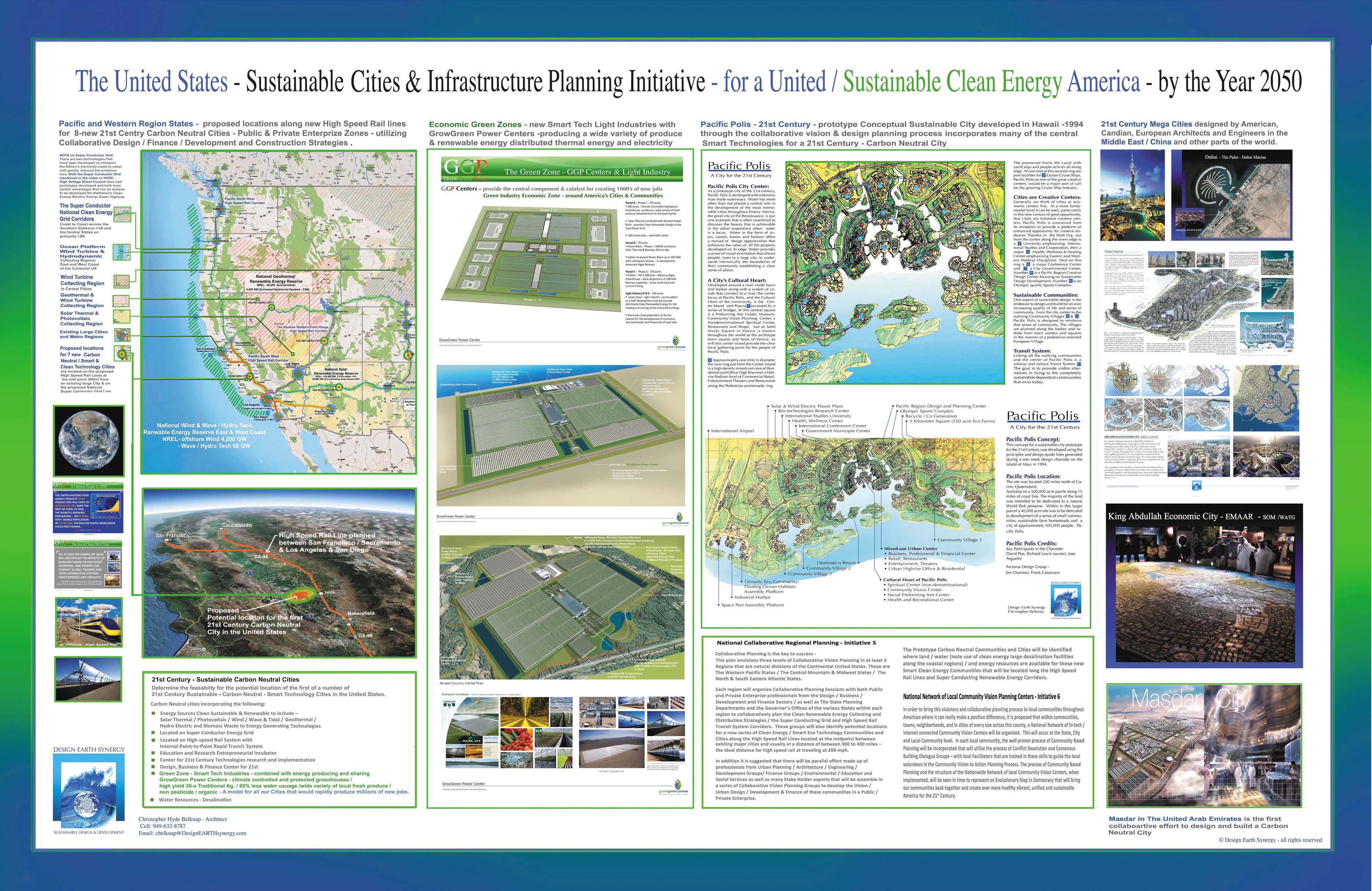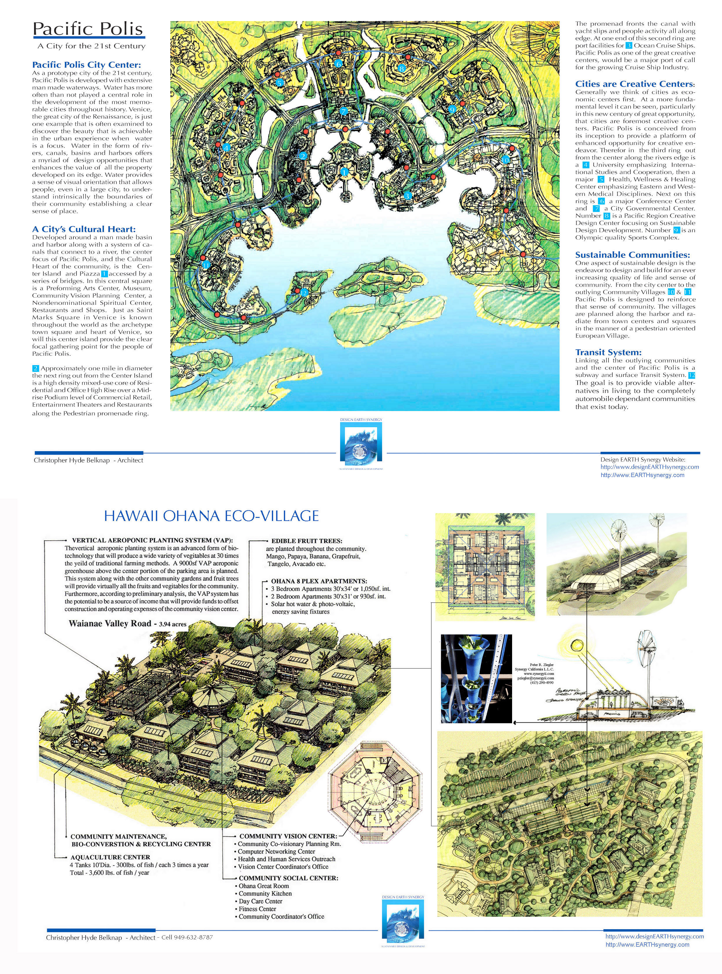 As a member of the team, Mr. Belknap developed a Master Plan to illustrate the central themes of Pacific Polis. In this same time period Mr. Belknap, along with sustainable engineer – Reinhold Ziegler, also developed a concept for building Self-sustaining Eco-Villages that incorporated, sustainable agriculture throughout the development, including Solar / Wind – Hydroponic Greenhouses and a Community Vision Center that would address the sustainable living needs of small communities in Hawaii and many regions of the Developing World.