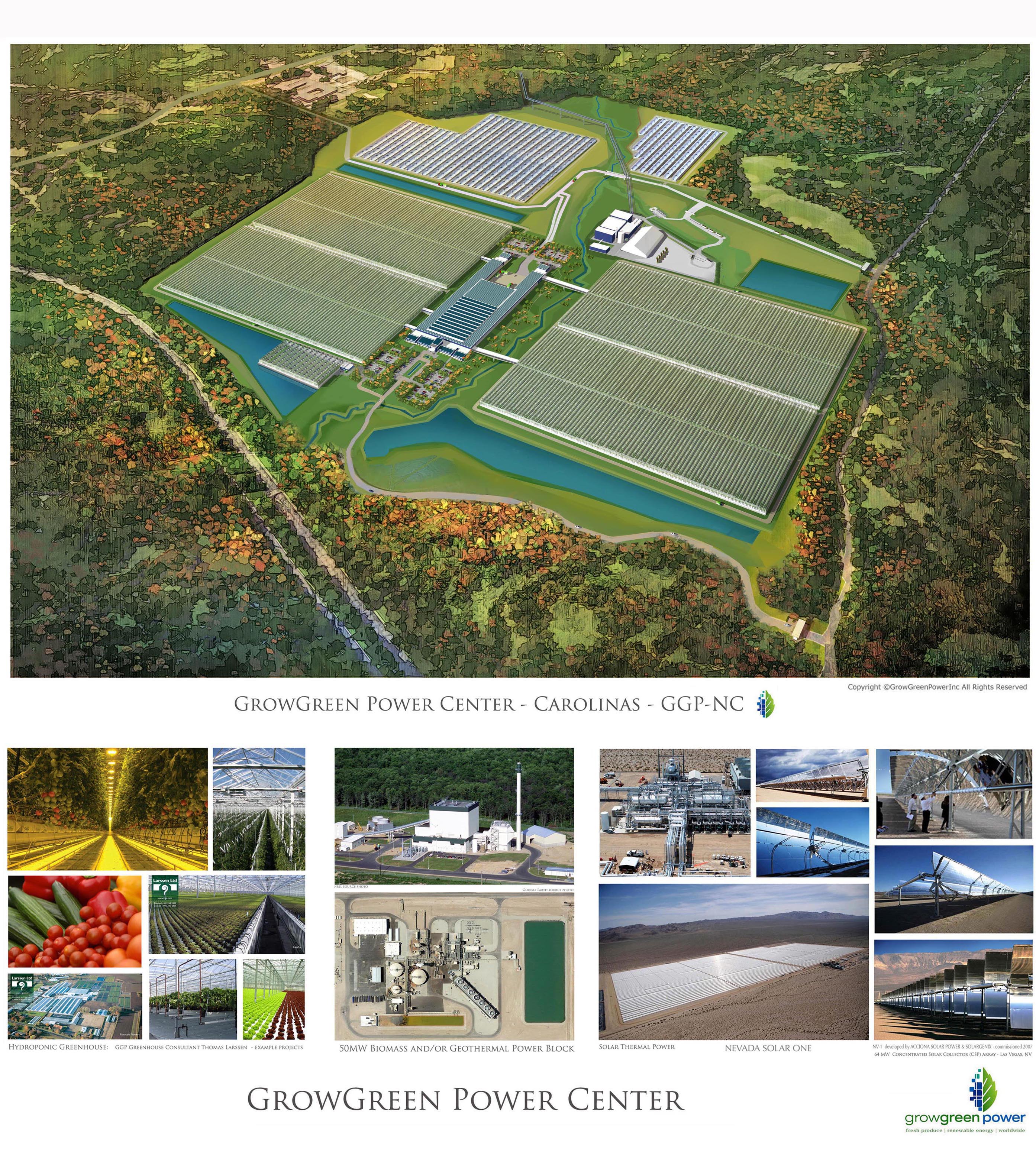 GrowGreen Power Centers incorporate various Renewable Clean Energy Technologies in combination with Sustainable Farming in the form of large scale commercial  Hydroponic Greenhouses that produce high yields in Local Produce (fruits, vegetables, herbs and lettuce) Production. These Sustainable -Energy Efficient/ water & resource efficient/ Pesticide Free /Climate Controlled Greenhouse & Energy Centers will, when replicated in cities Worldwide, contribute substantially in meeting the needs of a rapidly expanding World Population – using far less critical resources such as water and land requirements than traditional methods. A secure and reliable Clean Renewable Energy Supply and an abundant and Healthy Food Supply is an essential fundamental requirement for security and productive living in Communities Worldwide, and to minimize forces that can take hold that lead to confrontation and destabilized societies particularly with an increased population pressure of 3 Billion more people by 2050.