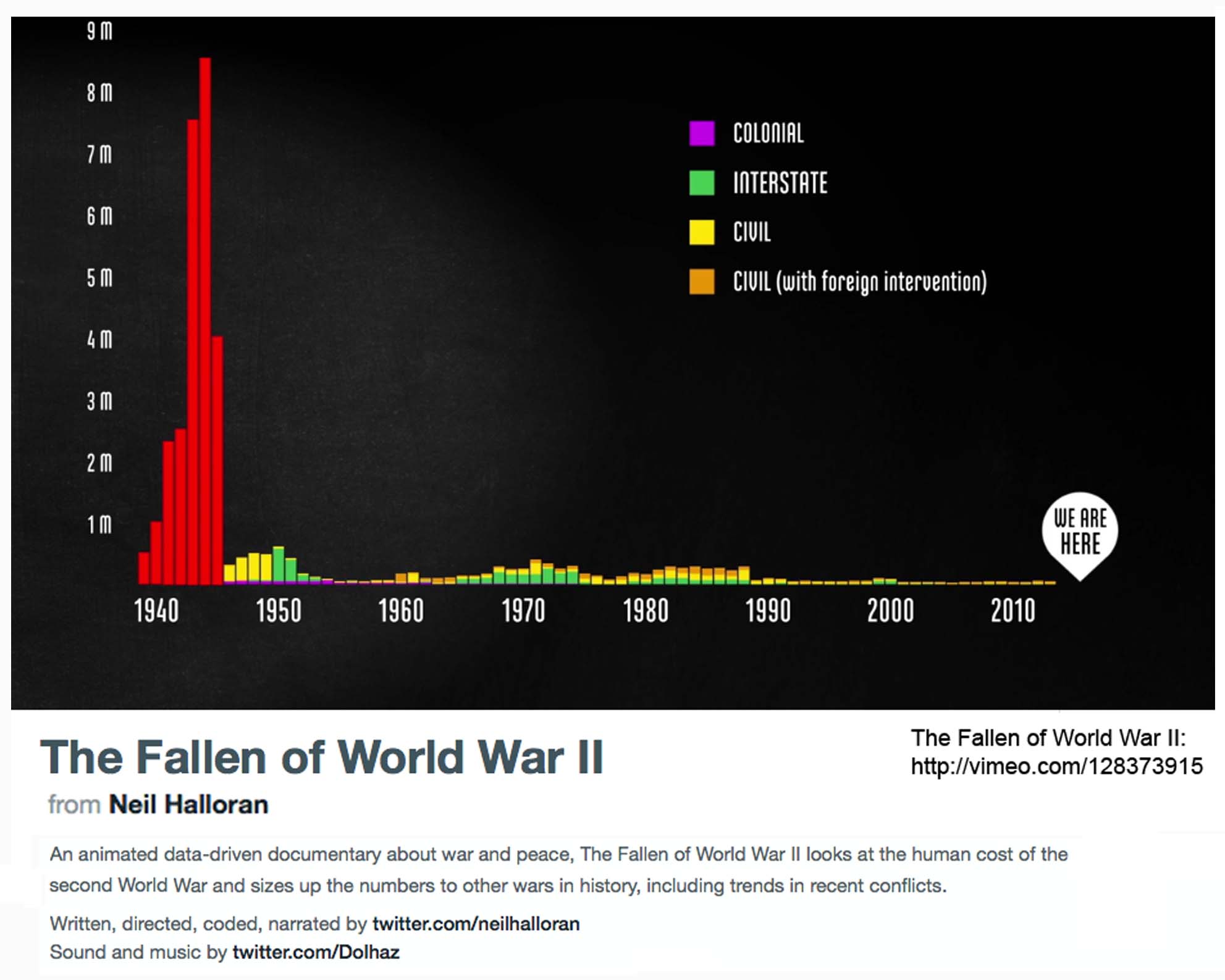 The Fallen of World War 2 – https://vimeo.com/128373915  Graphic Illustrated Record of all deaths – civilian & military in World War II – then relates to all Wars in World History – and then to deaths in War since World War II