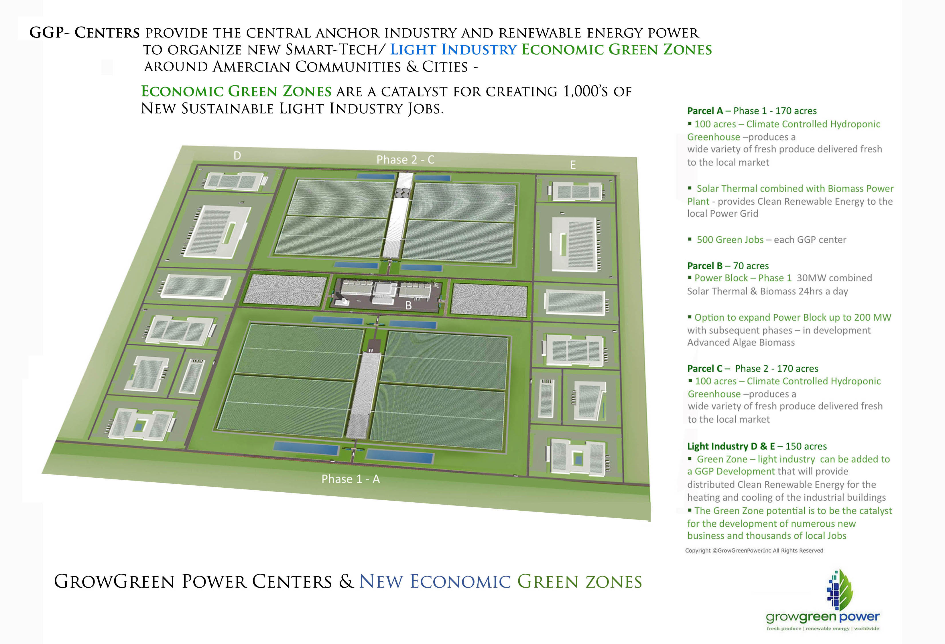 GrowGreen Power Centers are a fundamental building block in the emergence new Economic Green Zones that can be developed around American Cities and Communities producing much of what need in the United States at home with American resources in new High-tech, Sustainable Energy driven Net Zero Economic hubs. This will be the key to reinvigorating the American Economy and the American High Tech work force – with well paid and high quality American jobs.