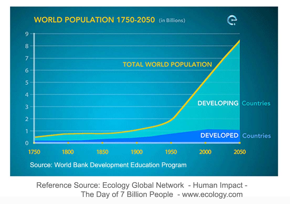 Note: The exponential increase in Global Population Growth since the dawn of the Industrial Revolution has been the driving force in each of the Five Critical Challenges. For an excellent overview of the past/ present & future World Population Situation and its Global Impacts – The Ecology Global Network website is an excellent resource.  Please refer to this link for a complete overview of Global Population http://www.ecology.com/2011/09/26/day-seven-billion/